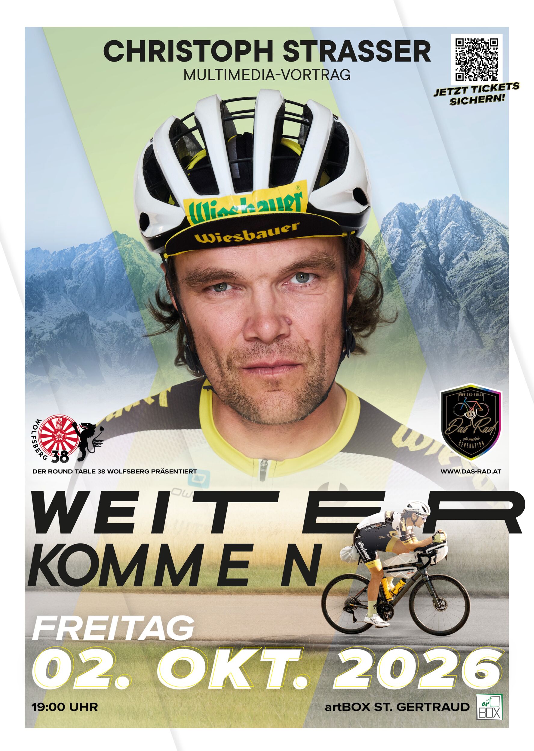 Christoph Strasser zählt zu den erfolgreichsten Ultracyclern der Welt: Sechs Siege beim Race Across America und ein 24-Stunden-Weltrekord machen ihn zur Legende. Doch nach Jahren im perfekt eingespielten Team wagte er den Sprung ins Unsupported Ultracycling – allein, ohne Hilfe von außen, auf bis zu 5.000 Kilometern quer durch Europa. Das Transcontinental Race wurde für ihn zur größten persönlichen und sportlichen Herausforderung. In seinem Multimedia- Vortrag erzählt Strasser mit eindrucksvollen Bildern und Geschichten, was es bedeutet, Komfortzonen zu verlassen, Veränderungen anzunehmen und sein eigenes „Weiterkommen“ in die Hand zu nehmen.